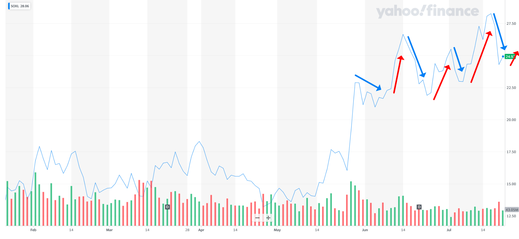 5월 중순 급격한 상승 이후 주가의 흐름을 살펴보면 하락과 상승을 반복하고 있는 모습입니다.